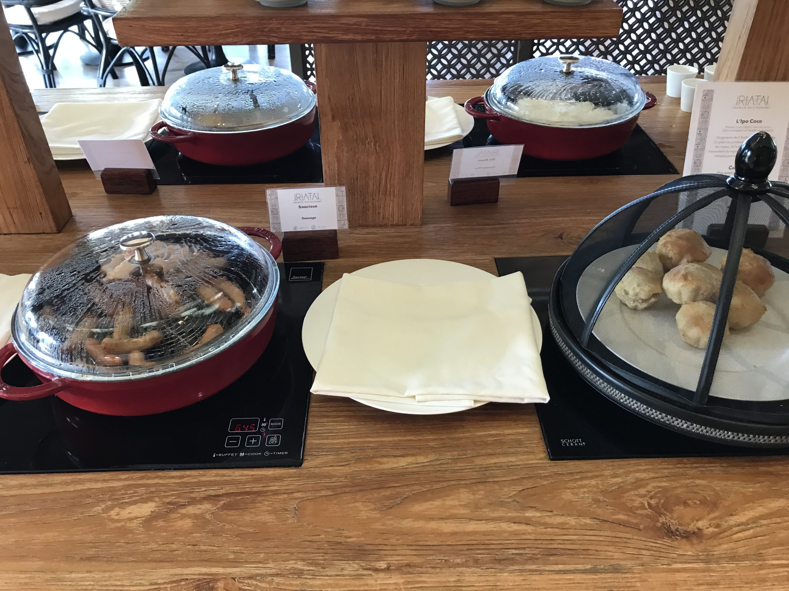 Gold以上は朝食無料です。バフェスタイルでした。マスクをしてHand sanitizerで手を綺麗にしてから、自分で皿とトングをとり、それを使って食べ物を皿に取っていく。使ったトングは水の入ったボールに入れる。