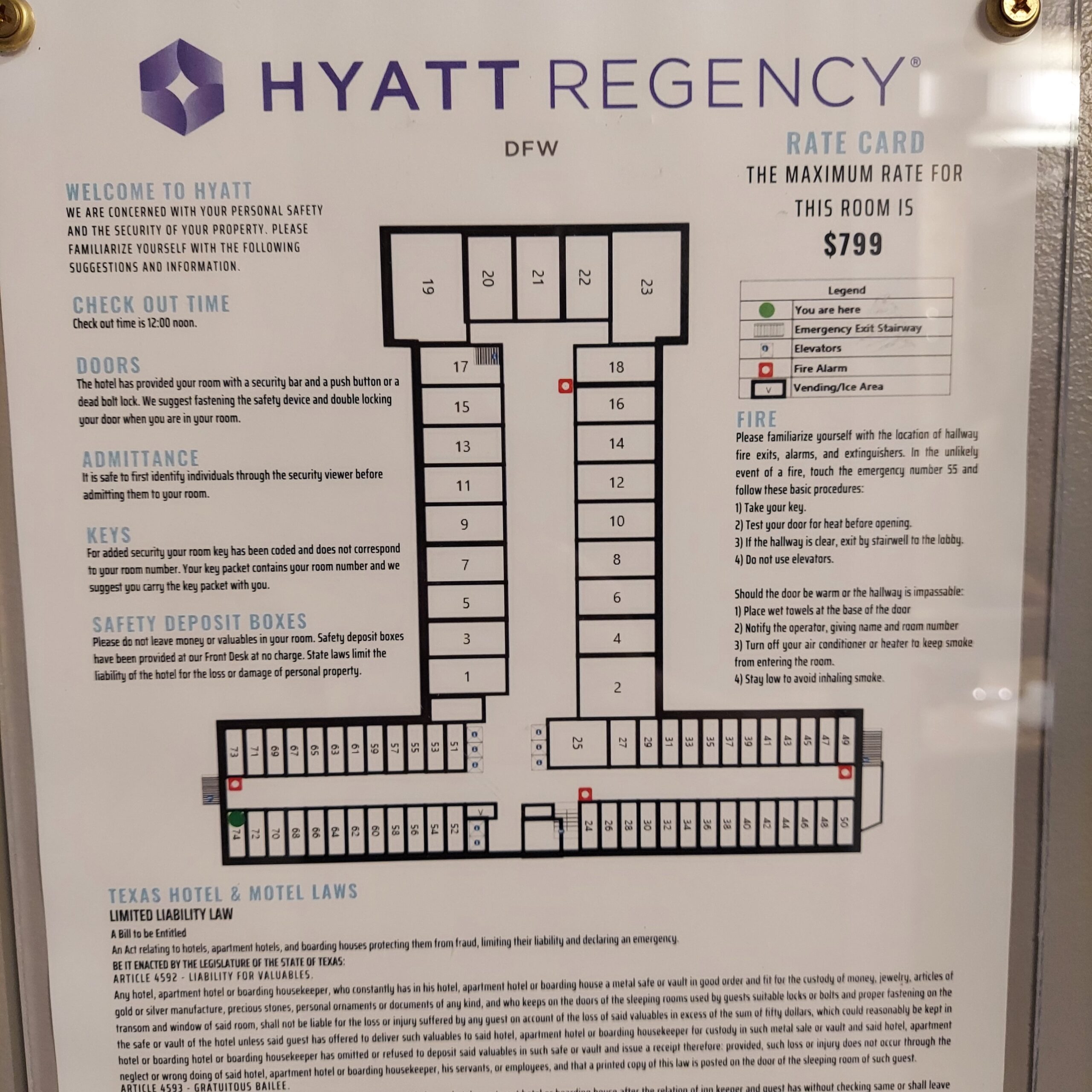 DFW近くにはHyattホテルが2つあります。Grand HyattとこのHyat Regencyです。Grand Hyatt DFWはDFW直結なので必要ポイント数が多い。その一方このHyat Regency DFWはターミナル直結ではなく古いのでカテゴリー2です。