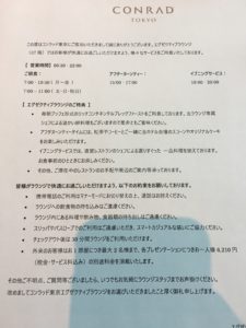 となるとSakiさんが確認した7月には私の聞いた2月から状況が変わったんですかね~?当時Eメールでコンラッド東京の予約係りの方とやり取りをして異なる二名の方から回答をもらいました。見返すとどちらのメールにも3人目が18歳以上の場合の7500円(税、サ別)にはラウンジ使用料は含まれていると書かれています。