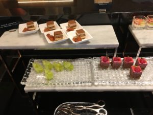 食べ物はお腹いっぱい系になる炭水化物は少ない印象でしたが、どれも普通に美味しかったです。ラウンジの食べ物は28階にあるレストランで提供されているものと同じ食べ物のようです。